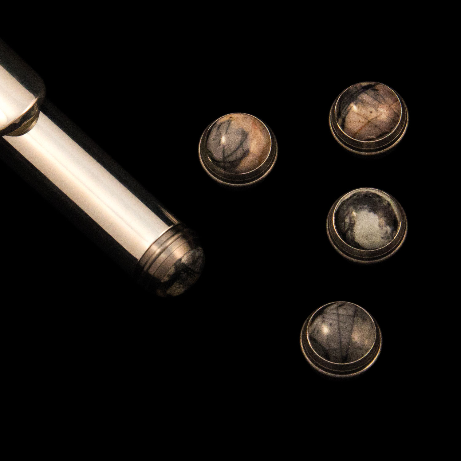 We experimented with many different crown materials and found titanium to be the most resonant, and that it elevates the flute's overall sound to another level. The weight, shape, and placement of the inlaid semi-precious stone are also carefully balanced to enhance the instrument's feel, sound, and response.